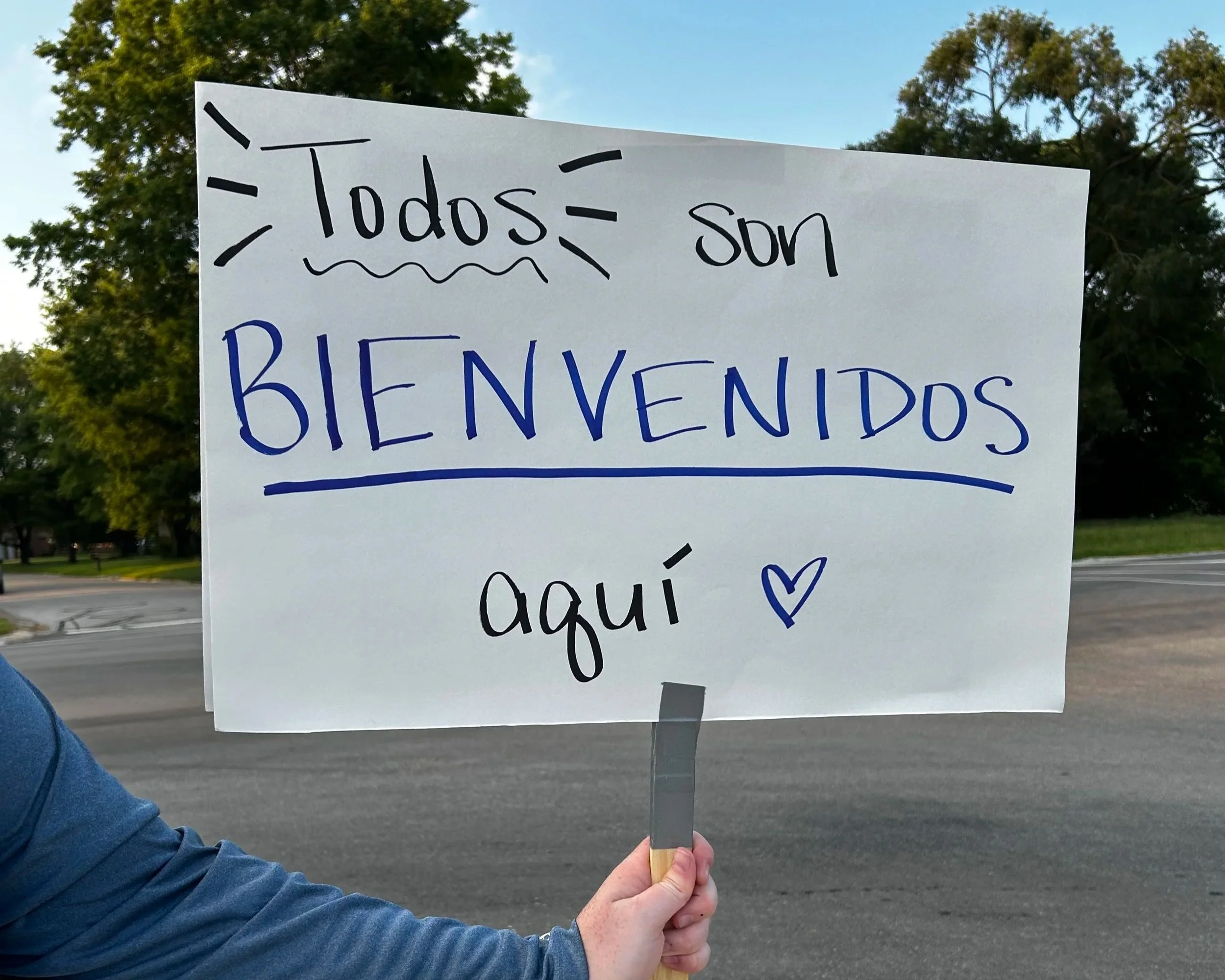 A small crowd gathered outside of the event with signs reading things like: “Mr. Stoops, you have failed your community,” “Deport ICE,” “Everyone is welcome here,” and “Todos son bienvenidos aquí.”