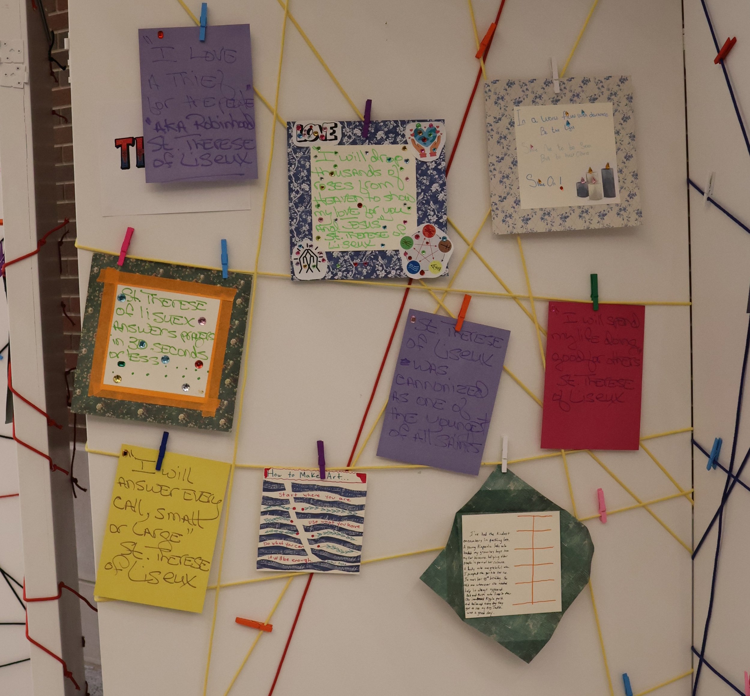 Several standing panels are crisscrossed with threads of fiber. Participants are encouraged to use the supplied materials and make a statement that can be hung on the fibers and in turn create a tapestry of spiritual and uplifting messages that connect us all.